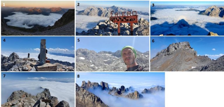 1. Frío amanecer sobre Valdeón. 2 y 3. Desde la Cima de la Torre del Friero. 4. En la cima del Llambrión. 5. Hoyo Trasllambrión, camino de Cabaña Verónica. 6. Peña Vieja desde la salida de la Canalona. 7 y 8. Cima de Peña Vieja y vistas. Poco después nos sumergíamos en la densa niebla y en la lluvia que en aquellos momentos inundaban Áliva.