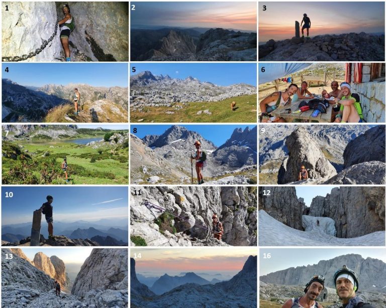 1 Corona El Rasu. 2 y 3. Amanecer en Torrecerredo. 4. Preparándonos para descender por Piedra Bellida. Peña Santa al fondo. 5 y 6. En Vega de Ario. 7. Bajando a los Lagos de Covadonga. 8. Llegando al Jou Santu, ya con material de escalada y ante Peña Santa. 9. Rampas finales de Peña Santa antes de la Llambrialina. 10. Cima de Peña Santa. 11. Rapelando en la Canal Estrecha. 12. La Forcadona. 13 y 14. Atardecer al salir de la Forcadona, sector leonés del Anillo por delante. 15. Preparados para la primera noche en Vega Huerta, ante la Sur de Peña Santa.