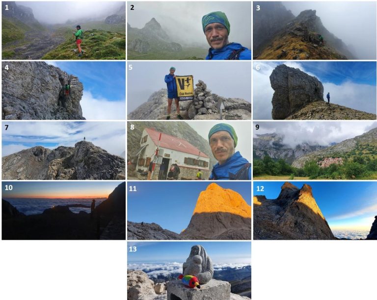 1 y 2. En el Canalón del Jierru y 3. Cresteando desde la Horcada del Jierru. 4. Trepada final a la Morra de Lechugales. 5 y 6. Morra de Lechugales. 7. Cresteando hacia la Pica del Jierru. 8. Casetón de Andara. 9. Bajando a Sotres. 10–12. Subiendo hacia El Picu. 13. Cima del Picu Urriellu.